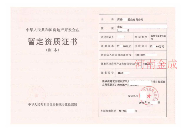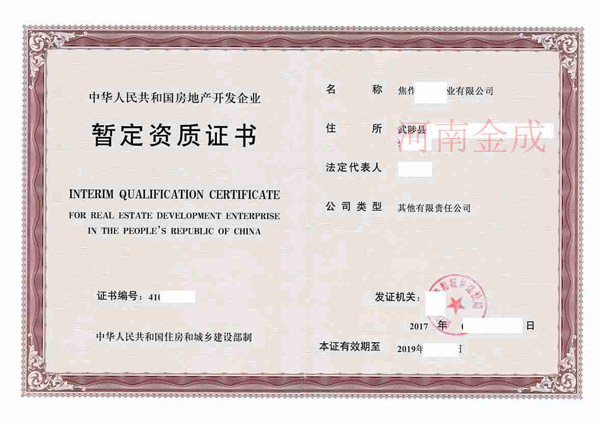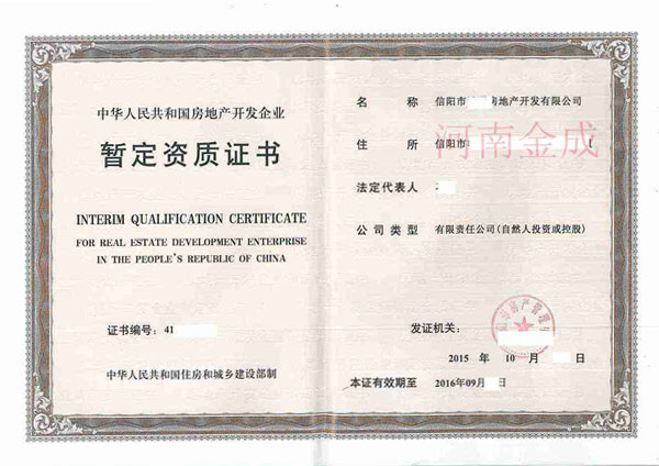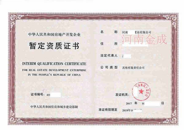 • 房地產(chǎn)暫定資質(zhì)證書(shū)